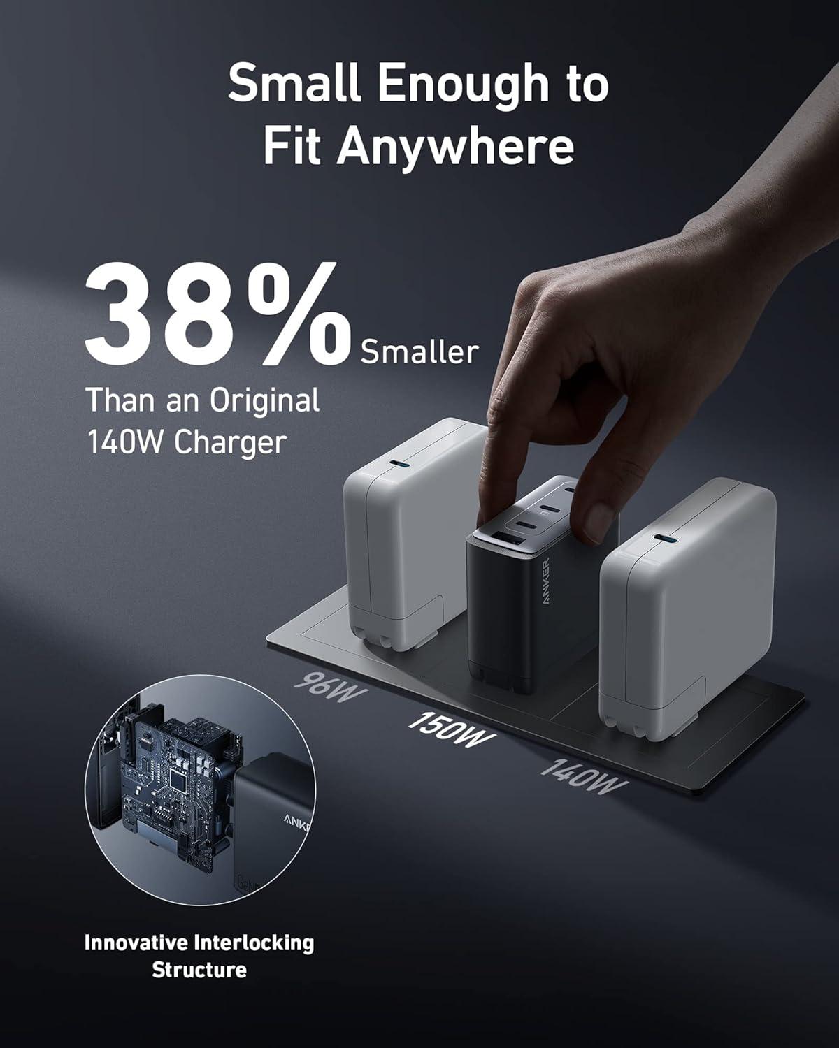 Compact Design with Mighty Output: Despite being 38% smaller than a 140W Apple-compatible charger, our compact charger packs a punch with a hefty 150W output.