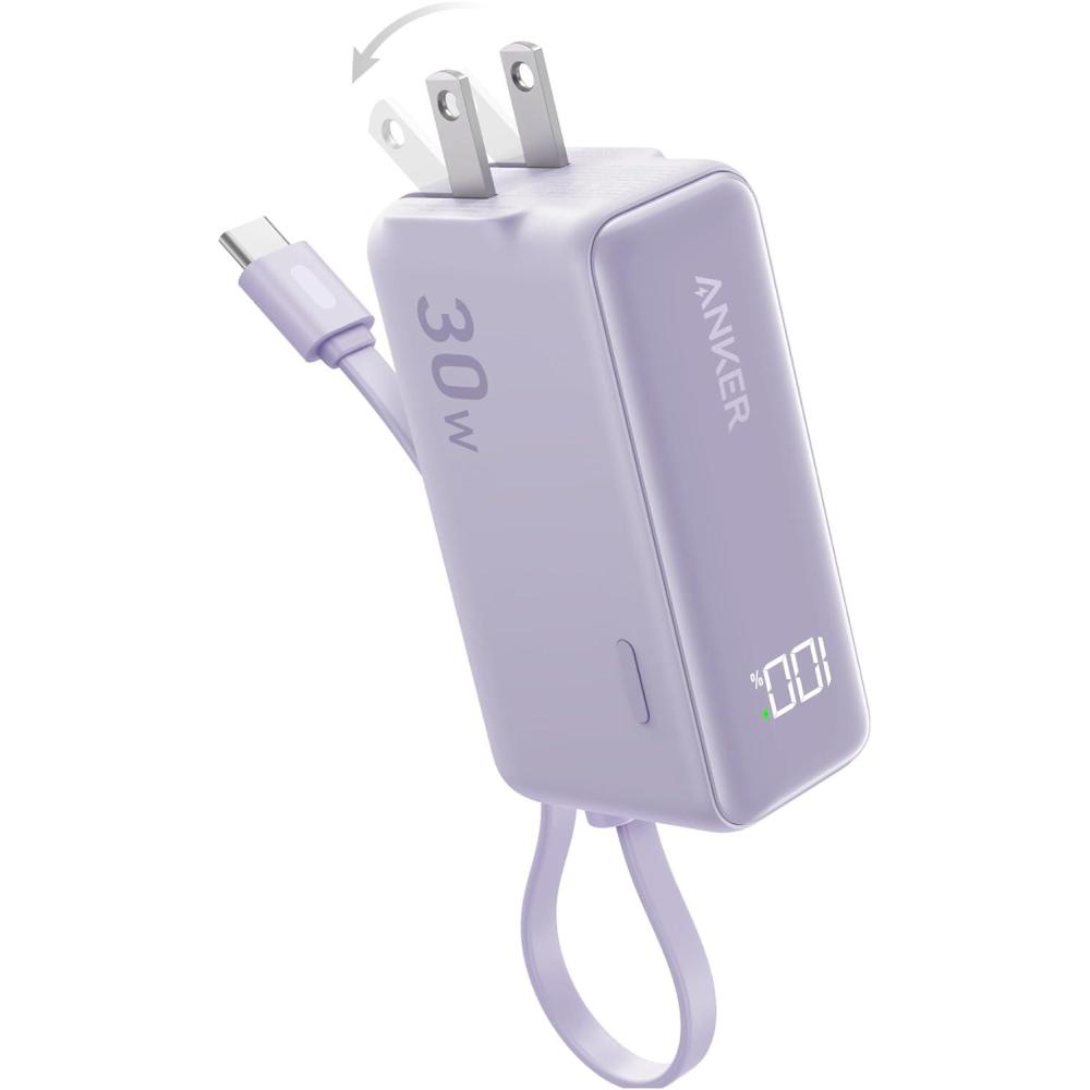 ANKER 3-in-1 Power Bank, 5,000mAh Portable Charger with Built-in Lightning Cable and Foldable AC Plug, 30W Max Compact Battery Pack, for iPhone 14 Series, Galaxy, MacBook, and More(Type C Cable(Violet))