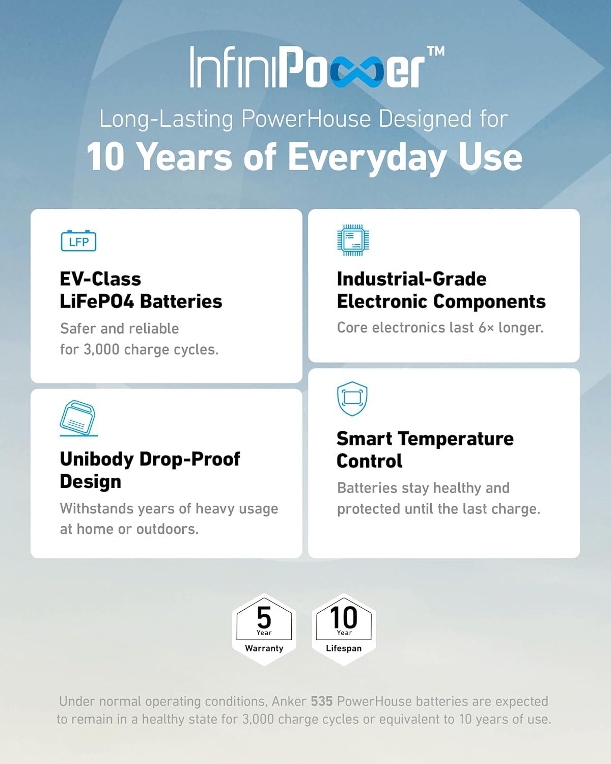 Long-Lasting Portable Power Station With a 10-Year Lifespan: With our proprietary long-lasting technology InfiniPower, combined with LiFePO4 batteries, ultra-durable electronic components, a smart temperature control system that monitors temperature up to 100 times per second, and impact-resistant structural design, Anker 535 PowerHouse is built to last over a decade, even with everyday use.