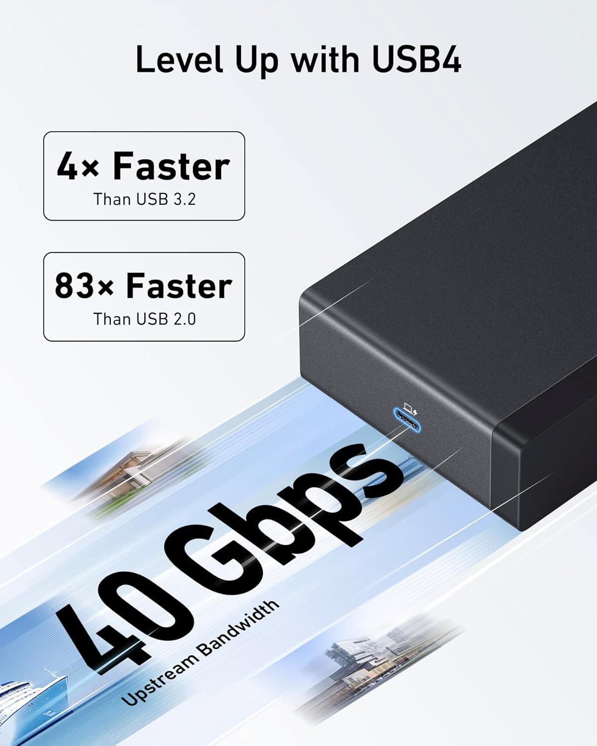 11-in-1 Expansion Powered by USB4 Technology: With an upstream bandwidth of 40 Gbps, you can simultaneously display media to a single monitor in 8K and transfer files at up to 10 Gbps. Equipped with a 100W max USB4 upstream port, 2 USB-C ports (10 Gbps, 30W), 4 USB-A ports, an Ethernet port, an HDMI 2.0 port, and 2 DisplayPorts.