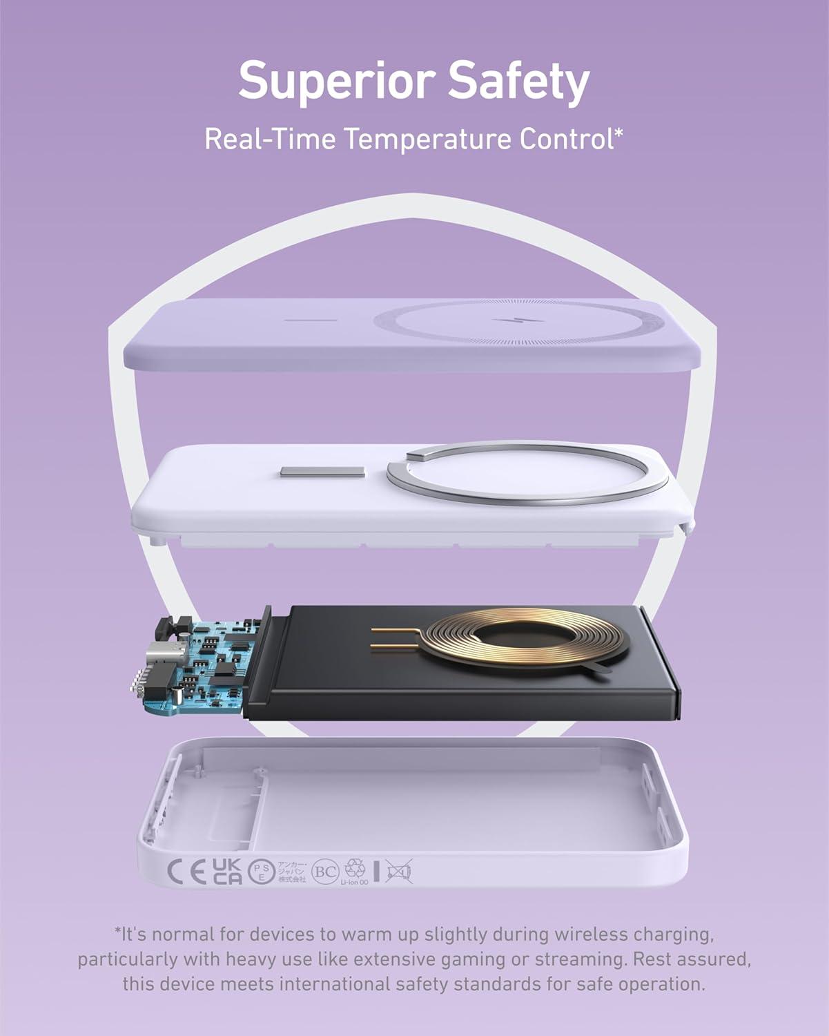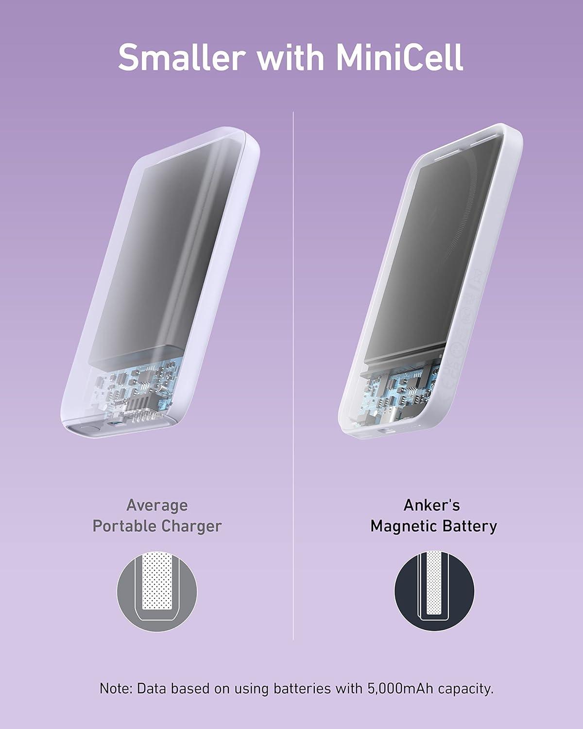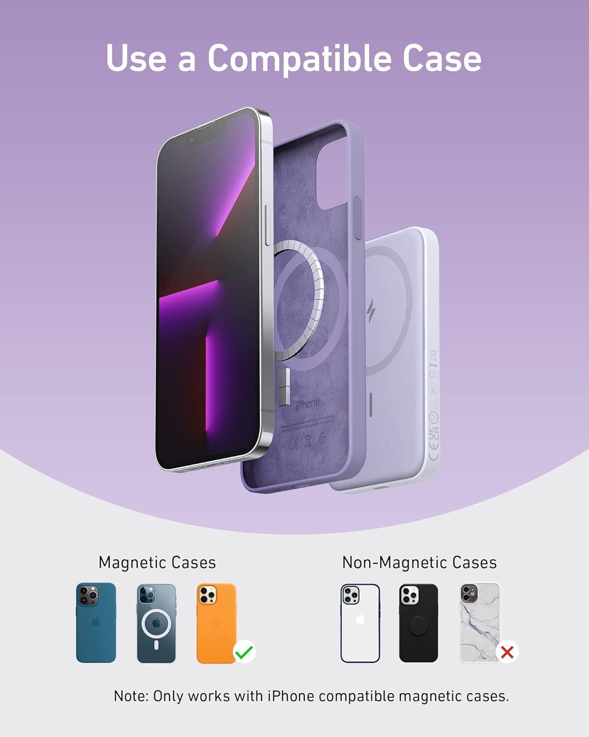 Anker 621 Magnetic Portable Charger (MagGo), 5,000mAh Wireless Power Bank with USB-C Cable, Magsafe-Compatible Battery Pack for iPhone 16/15/14/13/12 Series(Purple)