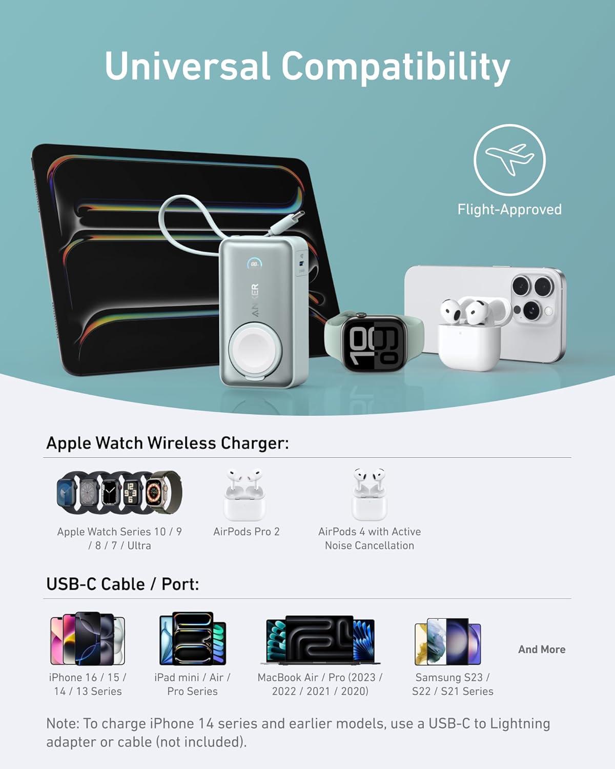 Travel-Friendly Power: Compact as a standard mouse at just 3.7 × 2.0 × 1.3 inches, it fits effortlessly into pockets or bags. Fully flight-approved, the power bank offers hassle-free travel charging, providing about two full charges for iPhone 15 Pro and up to 11 charges for Apple Watch Series 9.