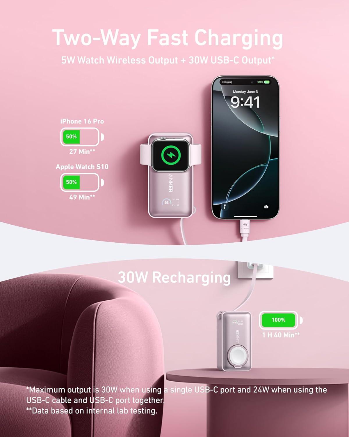 Anker MagGo Power Bank for Apple Watch, Officially Certified 10,000mAh Compact Battery Pack with Built-in USB-C Cable, 35W Max, for iPhone 15 Series, Samsung, iPad, AirPods, and More(Black)(Pink)
