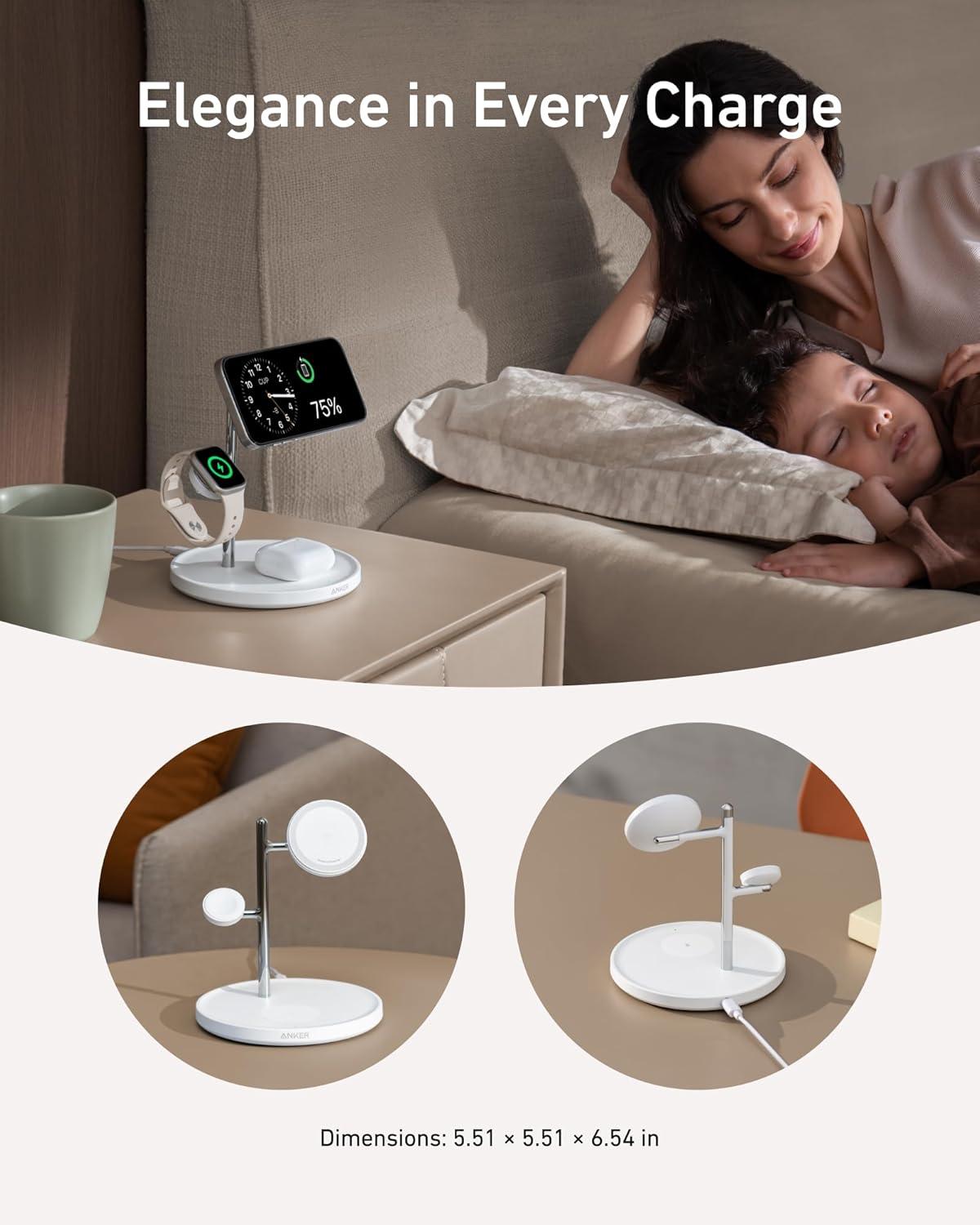Anker MagSafe Charger Stand, iPhone 17 Wireless Charging Station, MagGo 3 in 1 Charging Station, Qi2 Certified 15W Wireless Charger, Desk Accessory, for iPhone 17/16/15/14/13/12, Apple Watch, AirPods(White)