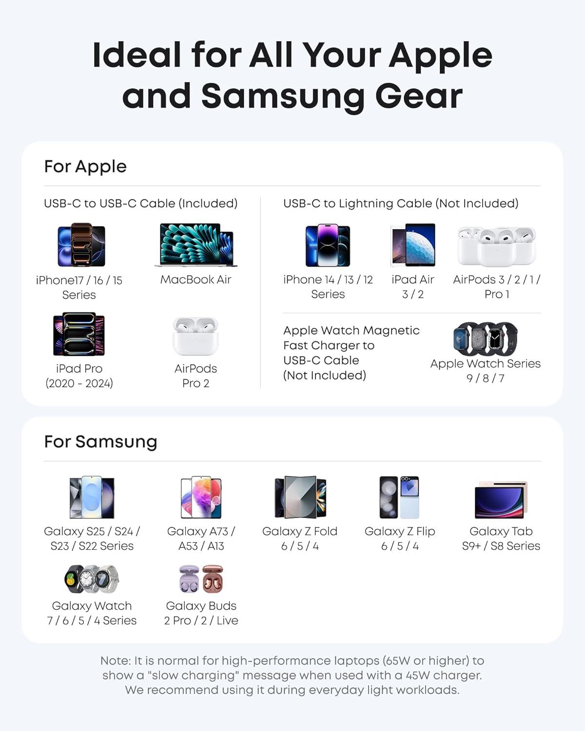 Universal Charging: Supports a wide range of devices, including Apple and Samsung, providing a reliable power source for all your charging needs.