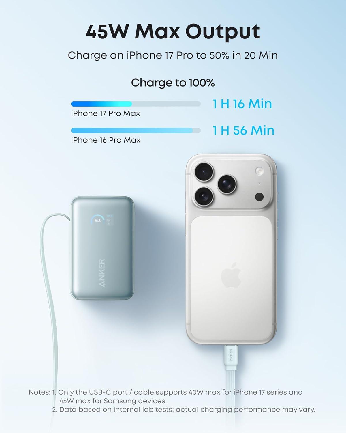Your Go-To Power Solution: Features a 10,000mAh capacity, 45W max fast charging, pass-through technology, a smart display, and 24/7 battery protection for safe, efficient power. The USB-C port and included cable support 40W fast charging for the iPhone 16 series and Samsung.