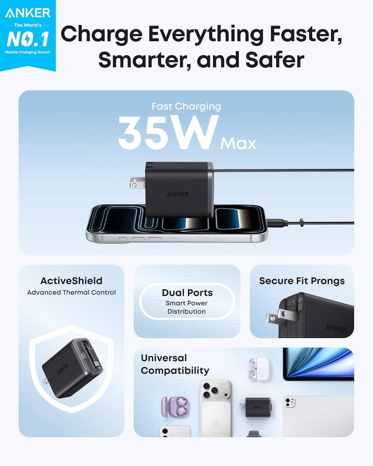 Smart 35W Max Dual USB-C Power: Featuring dual USB-C ports with smart power distribution, this charger enhances charging efficiency and simplifies daily use by eliminating the need for multiple chargers.