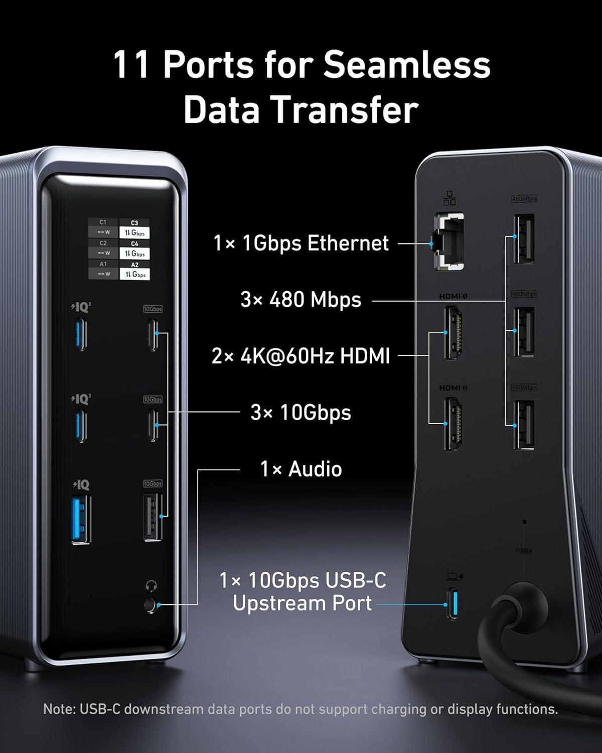 Master Your Data Flow with 11 Ports: Efficiently manage data across multiple devices with versatile ports offering speeds up to 10Gbps, complemented by dual 4K display and audio options.