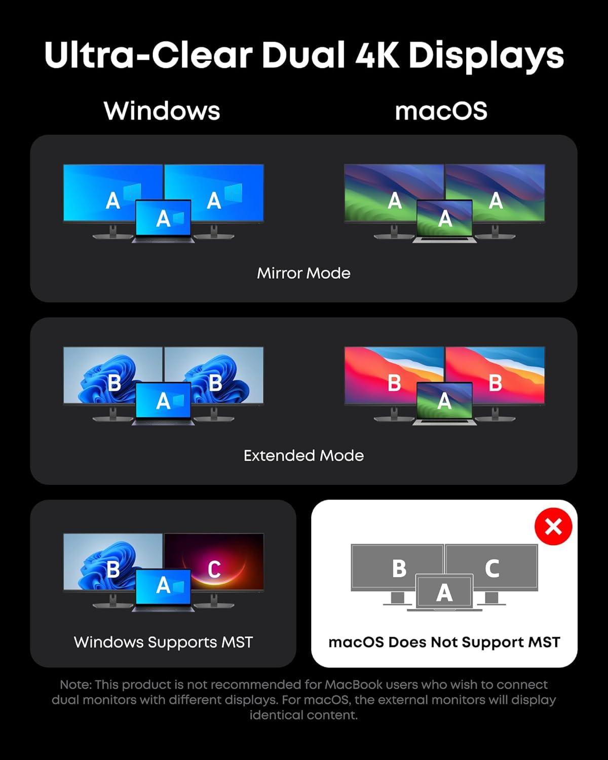 Compatibility: Supports USB-C, USB4, and Thunderbolt connections. Compatible with Windows 10 and 11, ChromeOS, and laptops that support DP Alt Mode and Power Delivery. Note: 1. For macOS, the displays on the both external monitors are identical. 2. This device is not compatible with Linux.