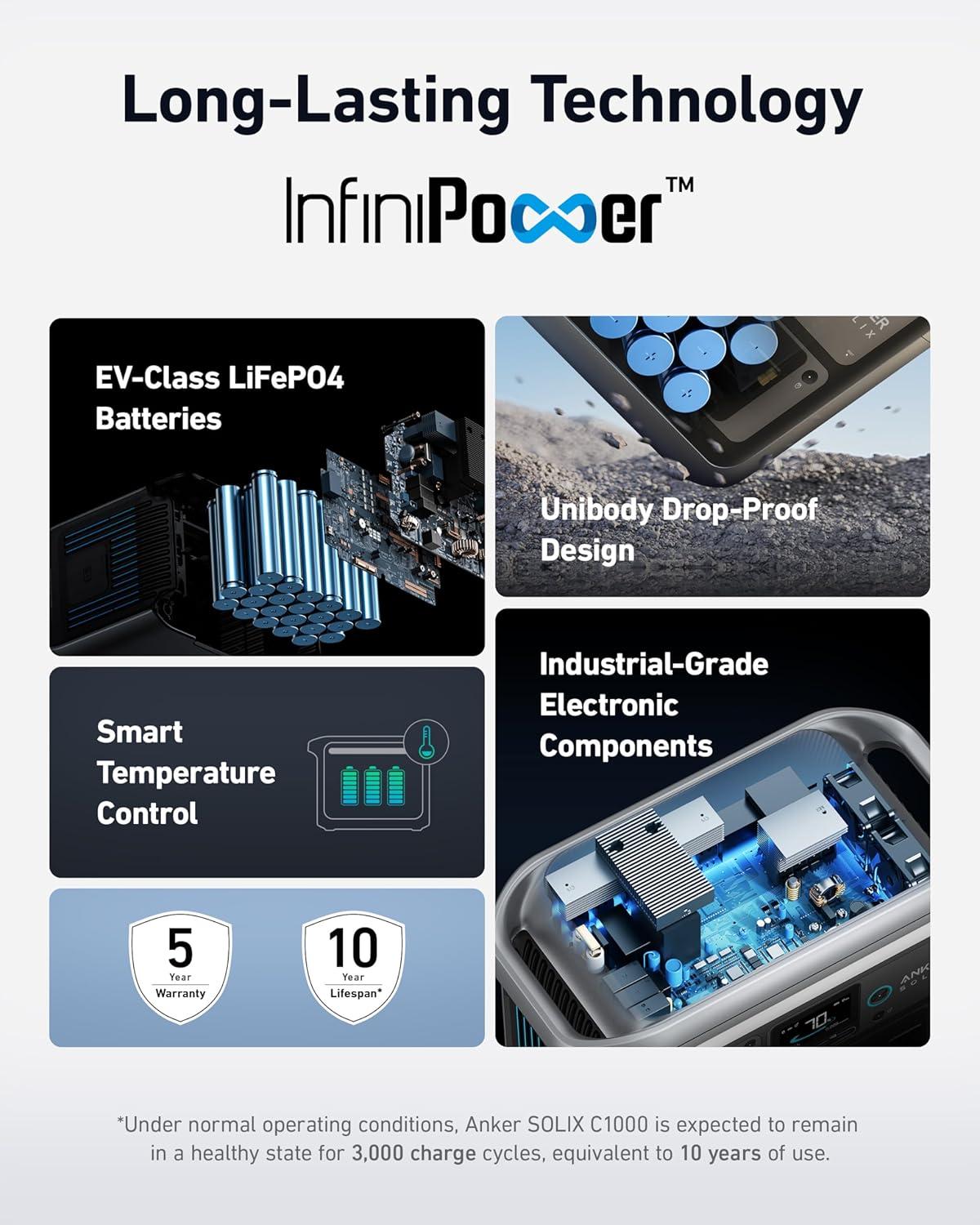 10-Year Lifespan, 3,000 Battery Cycles: Anker SOLIX C1000 is built to last with over 3,000 battery cycles. So power up, day after day, for 10 years.