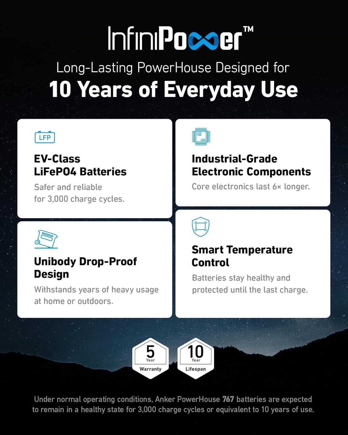 Long-Lasting Portable Power Station With a 10-Year Lifespan: With our proprietary long-lasting technology InfiniPower, combined with LiFePO4 batteries, ultra-durable electronic components, a smart temperature control system that monitors temperature up to 100 times per second, and impact-resistant structural design, Anker PowerHouse 767 is built to last over a decade, even with everyday use.