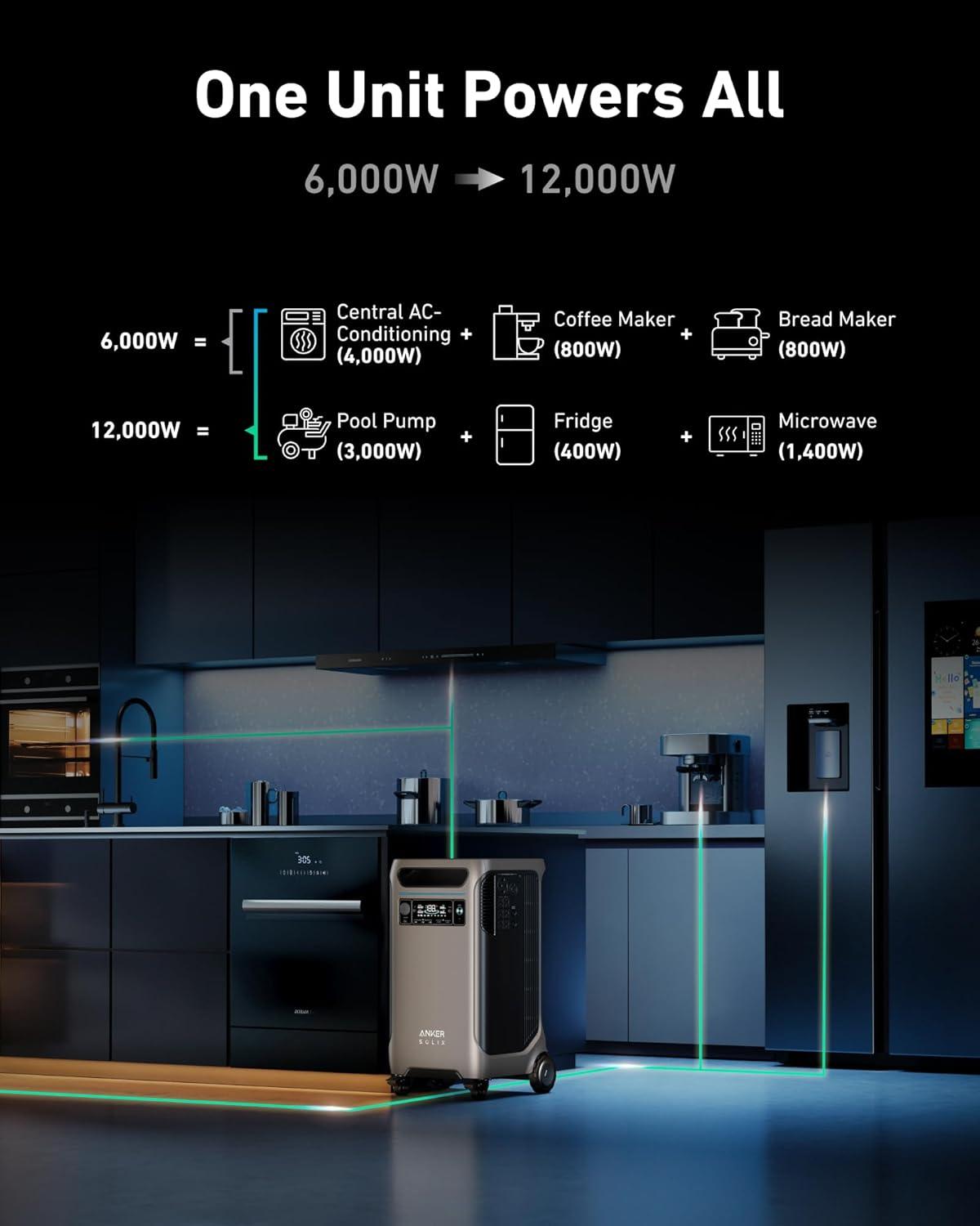 Dual-Voltage for Any Appliance: No more limitations when you're powering your dryer. The 120V/240V and 6,000W AC output runs everything in your home. If you need more power, add another Anker SOLIX F3800 for 12,000W max AC output.